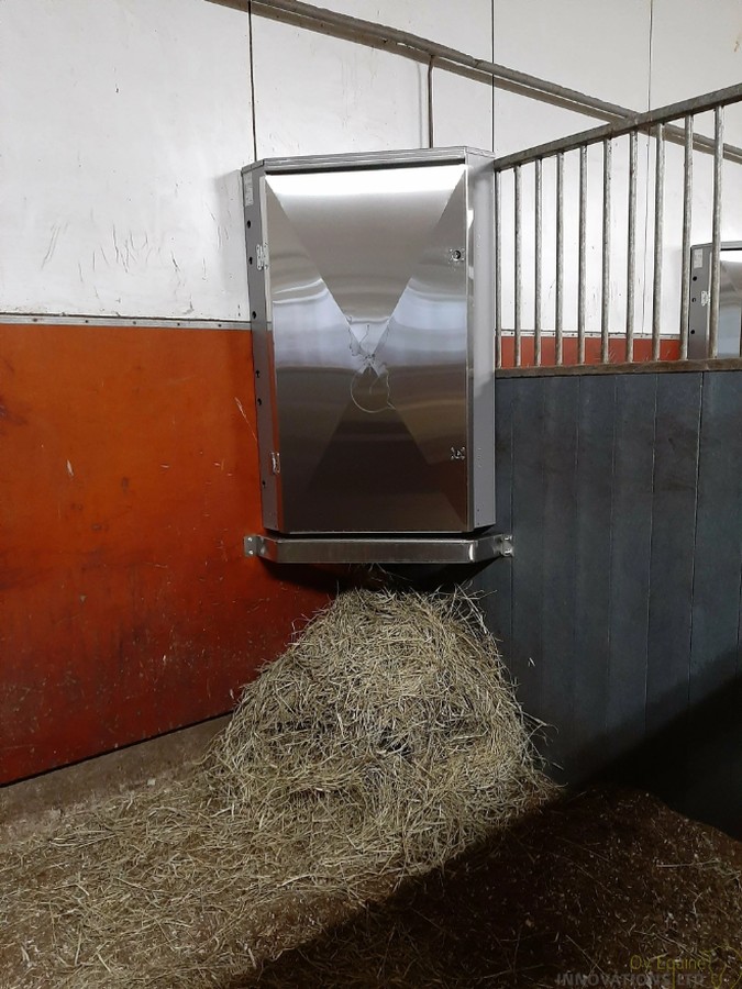 Dank des innovativen Systems können bis zu drei Heuportionen pro Tag ausgegeben werden – gesteuert über eine zentrale Zeitschaltuhr (separat erhältlich). Die Befüllung erfolgt direkt in der Box oder, falls baulich möglich, von der Stallgasse aus.