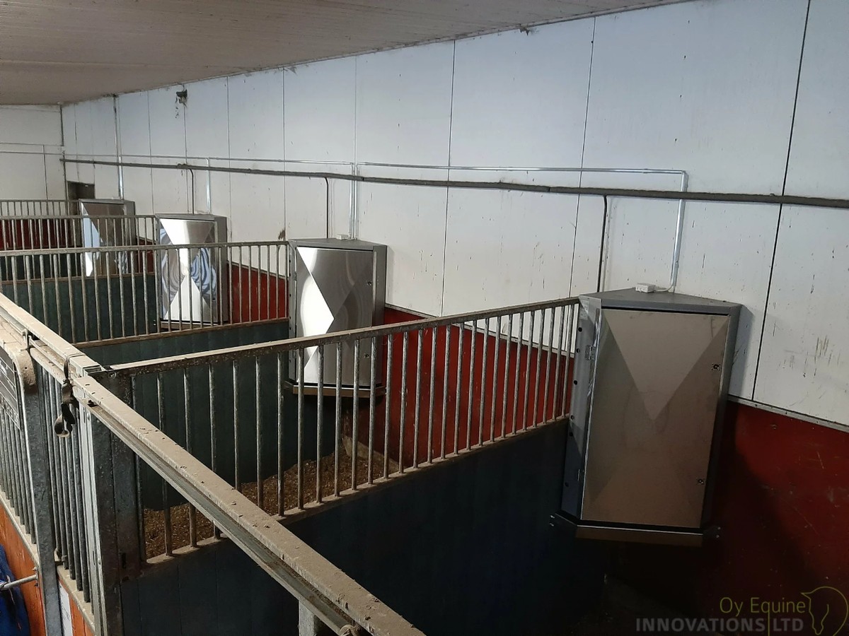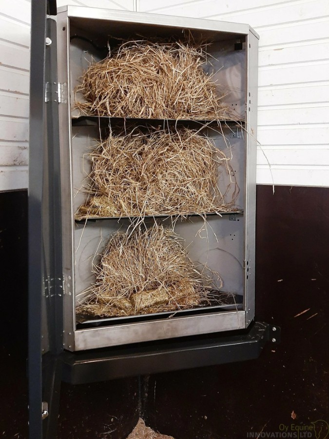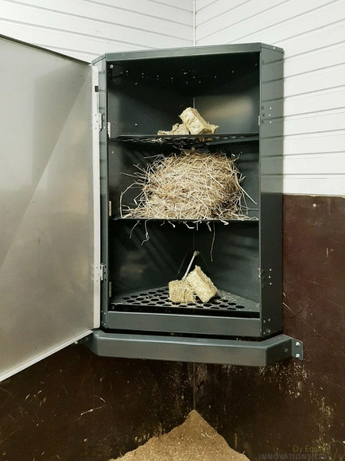 Der Heinätin 603 ist ein automatischer Raufutter-Automat für die zeitgesteuerte Fütterung direkt in der Pferdebox. Mit seinen kompakten Maßen passt er in nahezu jede Ecke mit einem 90-Grad-Winkel und ist somit ideal für Stallungen mit begrenztem Platzangebot.