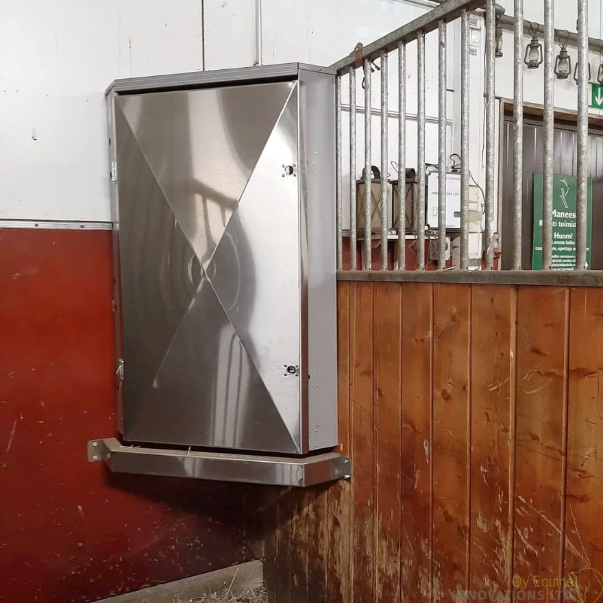 Der Heinätin 604 ist ein kompakter Raufutterautomat zur automatisierten Heufütterung direkt in der Pferdebox. Mit einer Breite von nur 60 cm lässt sich das Gerät platzsparend in jede Ecke mit 90-Grad-Winkel integrieren. Er eignet sich besonders für Ställe mit begrenztem Raum, ohne auf intelligente Fütterungstechnik verzichten zu müssen.