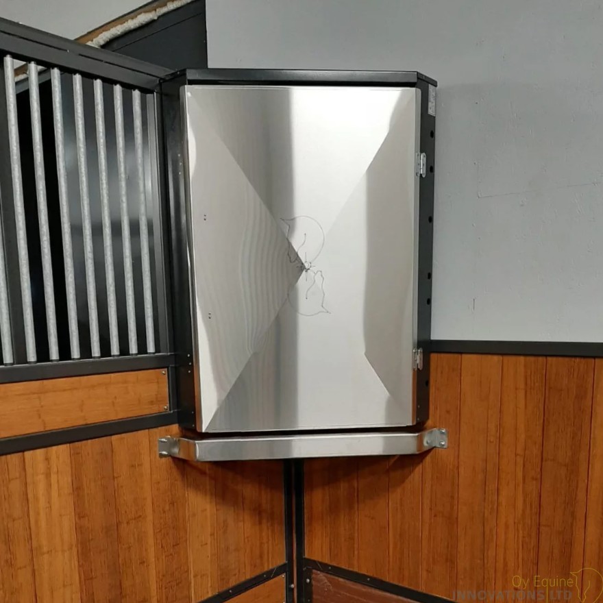 Dank seiner kompakten Bauweise passt der Automat in jede Ecke mit 90°-Winkel. Die Befüllung kann direkt in der Box oder – bei entsprechender baulicher Planung – auch bequem von der Stallgasse aus erfolgen. Eine separate Steuerung ist erforderlich und kann bis zu 25 Automaten gleichzeitig bedienen (nicht im Lieferumfang enthalten).
